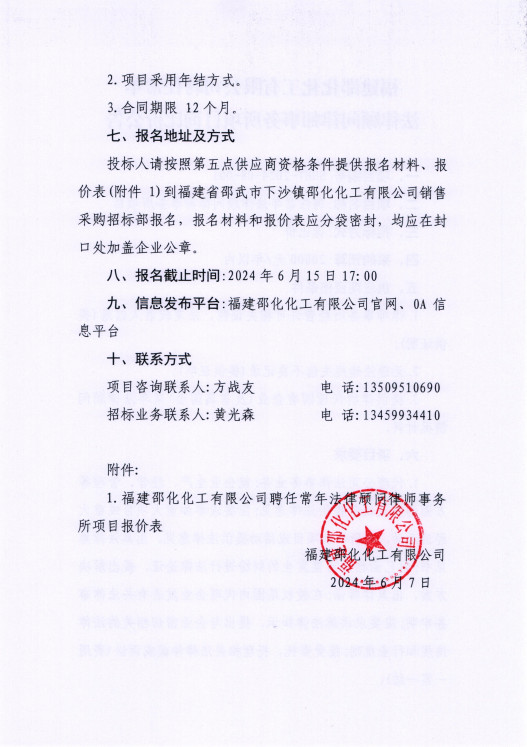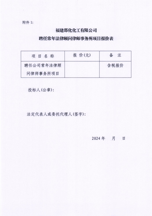 福建邵化化工有限公司聘任常年法律顧問律師事務(wù)所項(xiàng)目詢比價(jià)公告